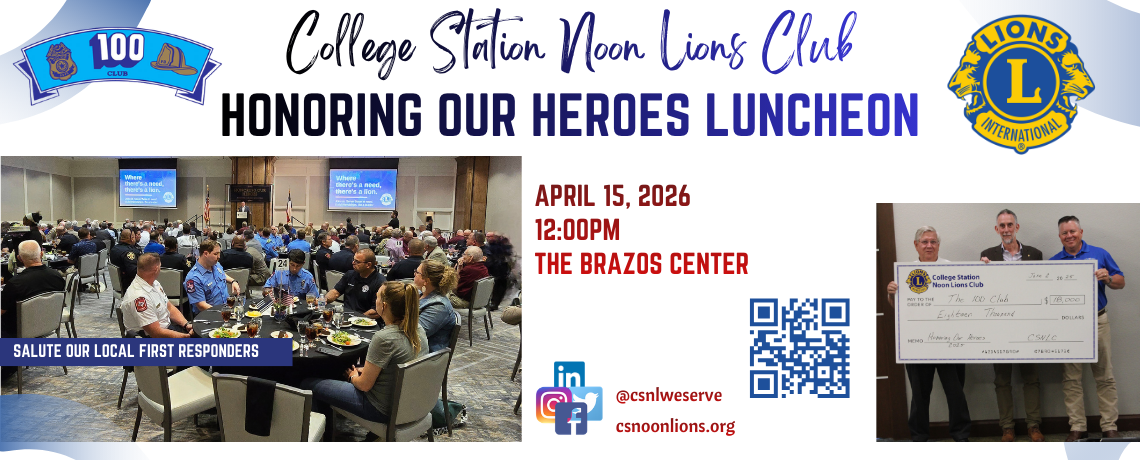 - College Station Noon Lions Club has been hosting the Honoring Our Heroes event for over 14 years. This event pays tribute to the local First Responders throughout Brazos County; and all funds raised from Honoring Our Heroes is divided equally between The 100 Club of Houston and the College Station Noon Lions Club.